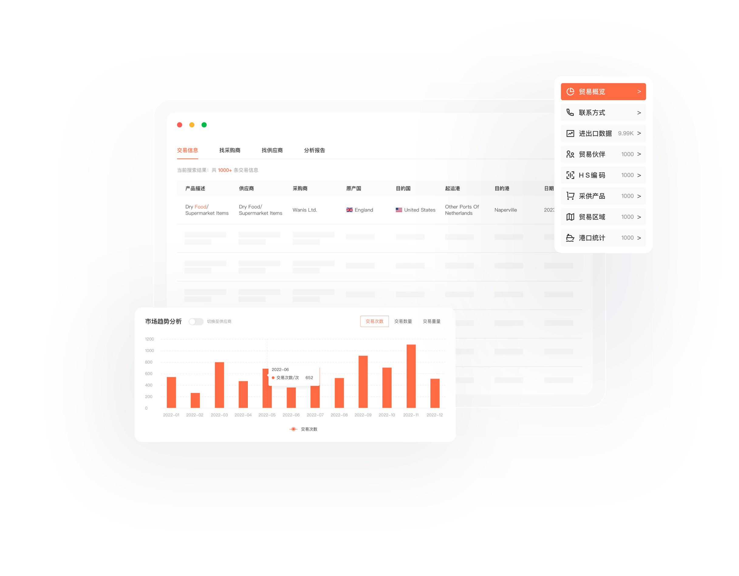 700万供应商,600万采购商,95%外贸重点拓展市场,包含交易时间、价格、数量、国别、货描、hs编码等等。